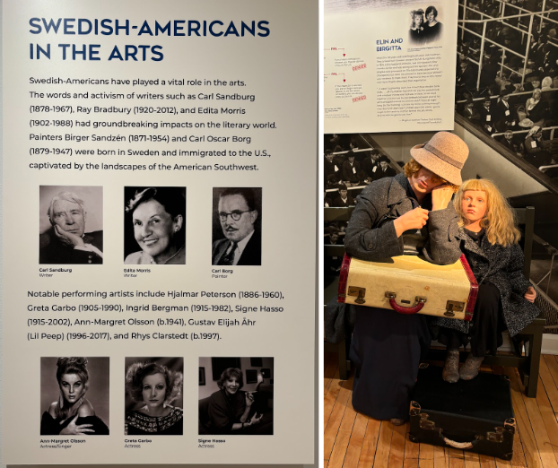 Left: Info panel on Swedish-Americans in the arts. How many do you recognize? Right: Mannequins representing Elin and Birgitta, real Swedish immigrants who had to stay on Ellis Island overnight until their sponsor picked them up.