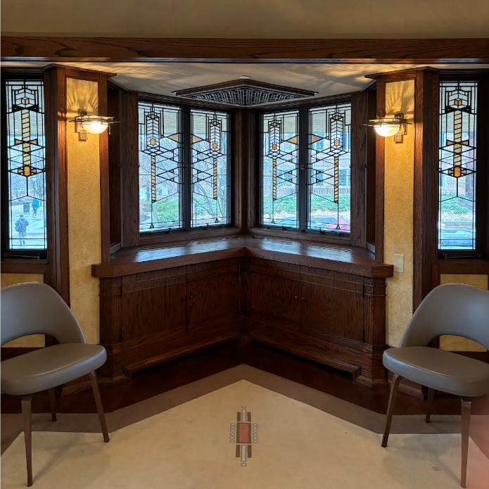 Patterns projected by Wright’s light sconces, and the corn pattern of his stained glass which connects the indoors with the prairie landscape.