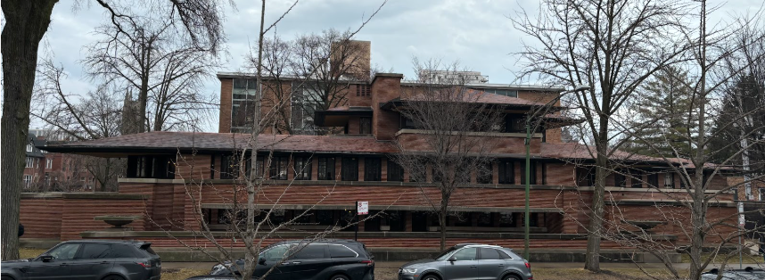 View of the Frederick C. Robie House from across the street. Notice the multi-layered terraces that give the house the illusion of being stretched horizontally.