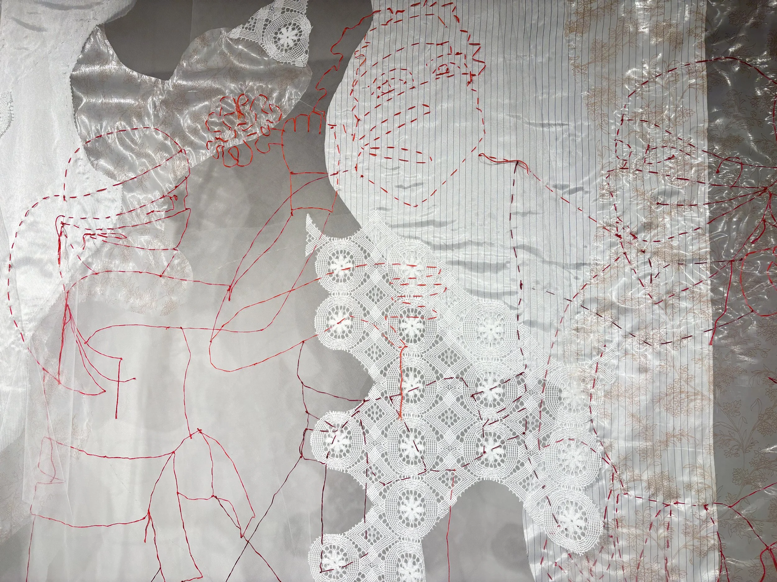 At either end of the exhibit are white collages of dancers embroidered in red thread, which Beaumont explained also reference camouflage and “Kapulli Yaocenoxtli’s red and white clothing.” The choice of sheer fabric, she explained, was because she was considering “space, landscape, light, fluidity, [and] movement…this dance army is as nimble as it is powerful.”