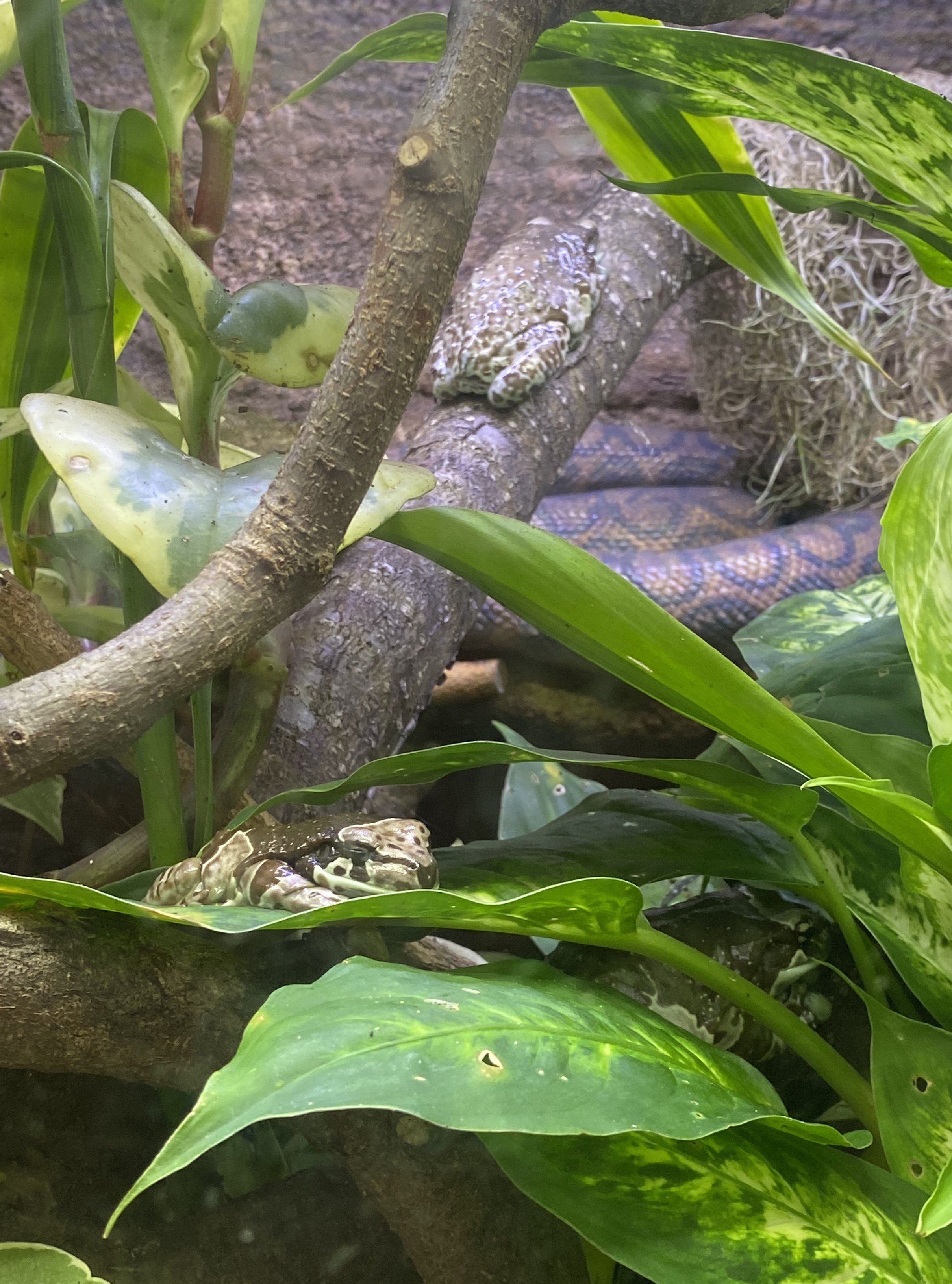 A few Amazon milk frogs and a Brazilian rainbow boa. Credit: The Wheel
